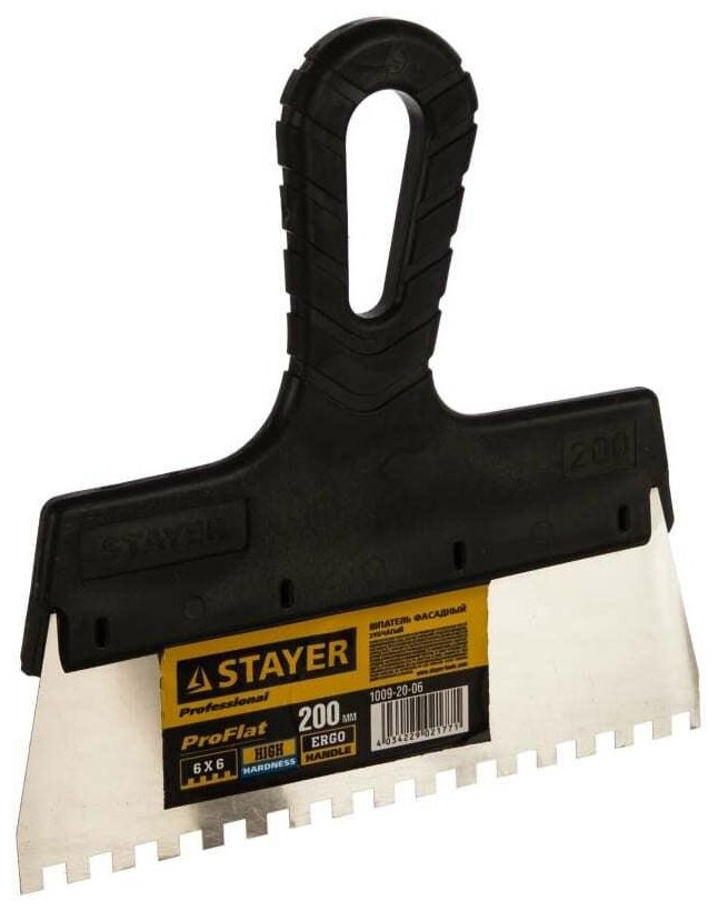 STAYER ProFLat 200 мм, зуб 6х6 мм, пластиковая ручка, зубчатый, нержавеющий, Фасадный шпатель, PROFESSIONAL (1009-20-06)