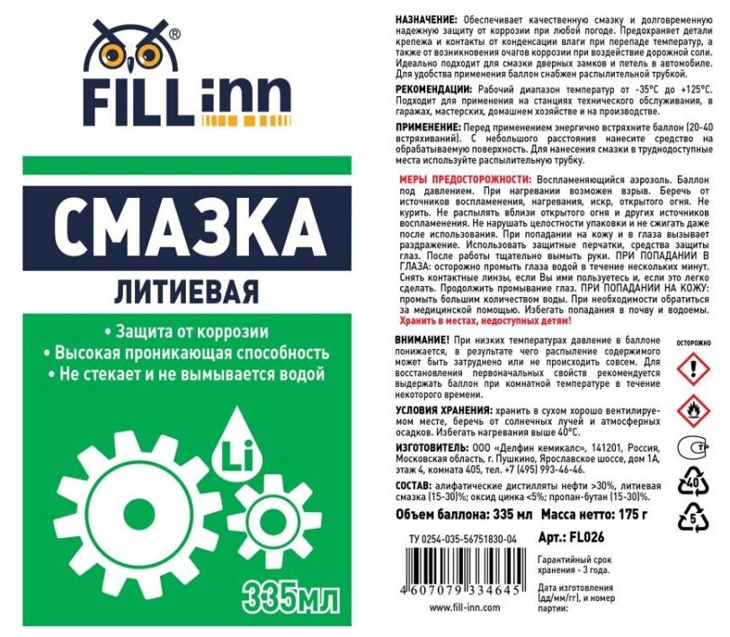 Смазка литиевая аэрозоль 335мл FILLinn FL026 FILL Inn FL026 754 ₽