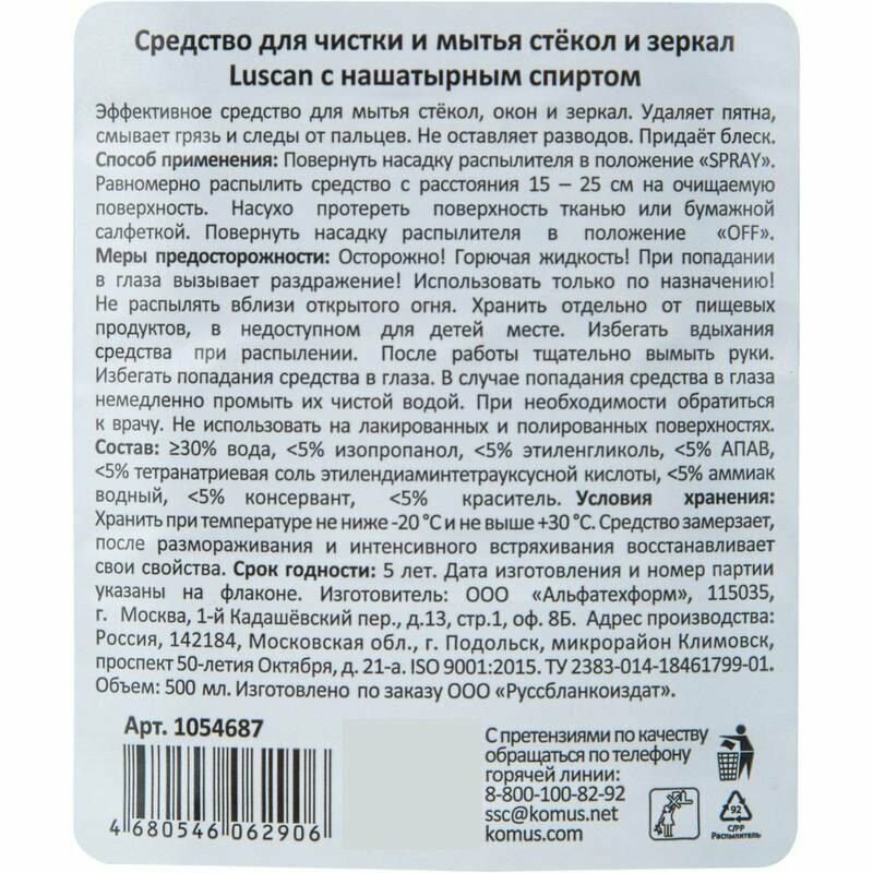 Средство для стекол и зеркал и зеркал с нашатырным спиртом Luscan 500 мл информация: