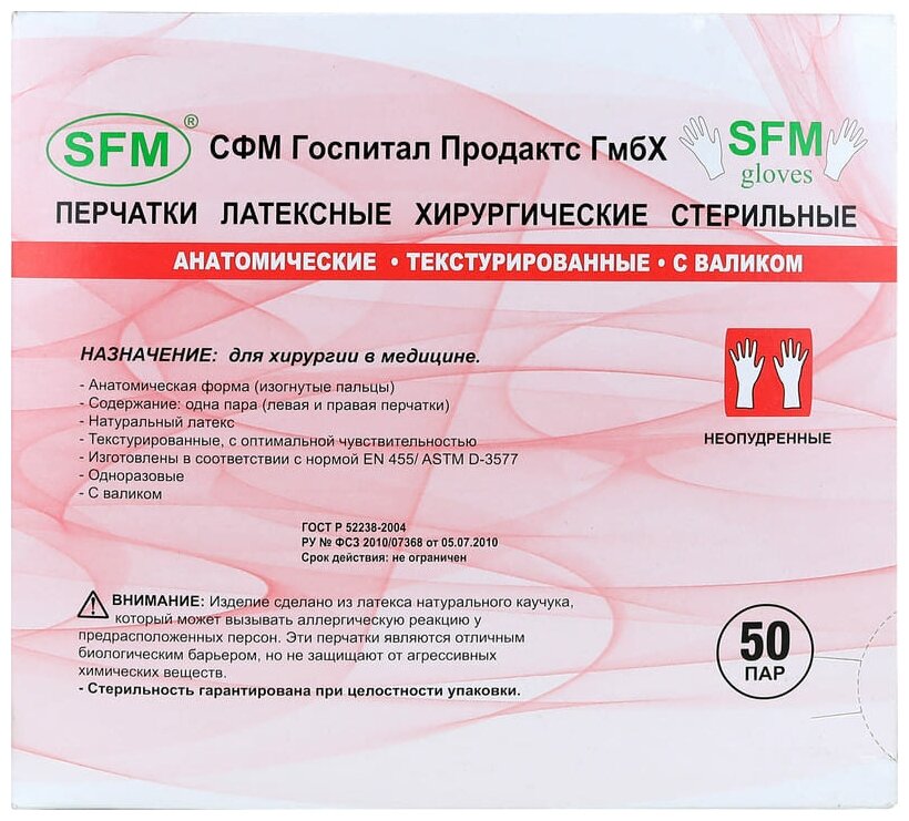 Перчатки медицинские СФМ Госпитал Продактс Перчатки хирург стерил латекс SFM неопудр текстур анатом 6 43 ₽