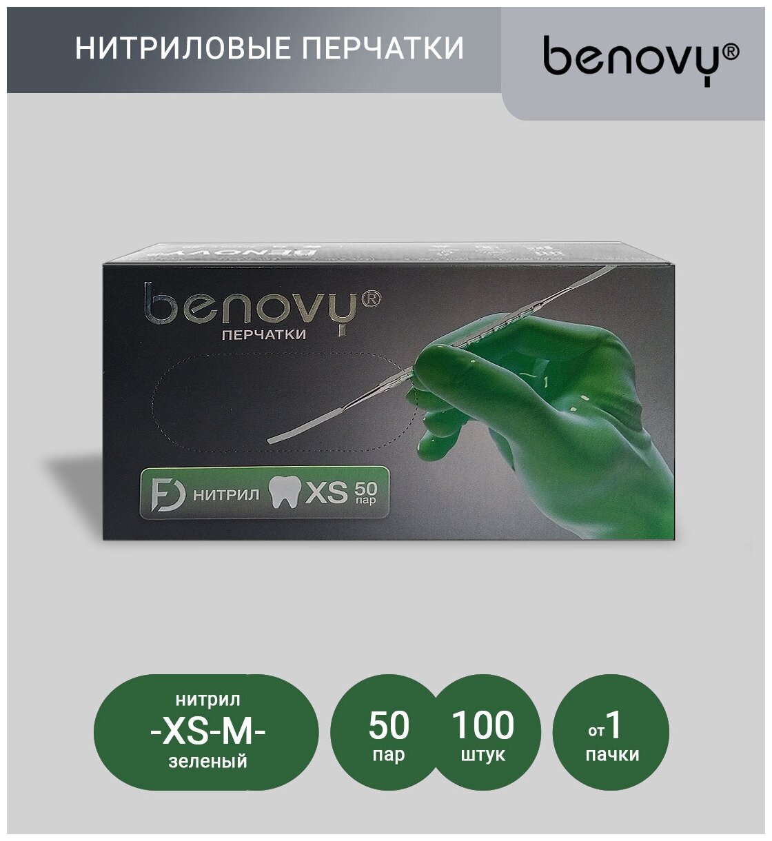 Перчатки нитриловые стоматологические Benovy Dental Formula, размер XS, 50 пар, 100 штук, зеленый цвет