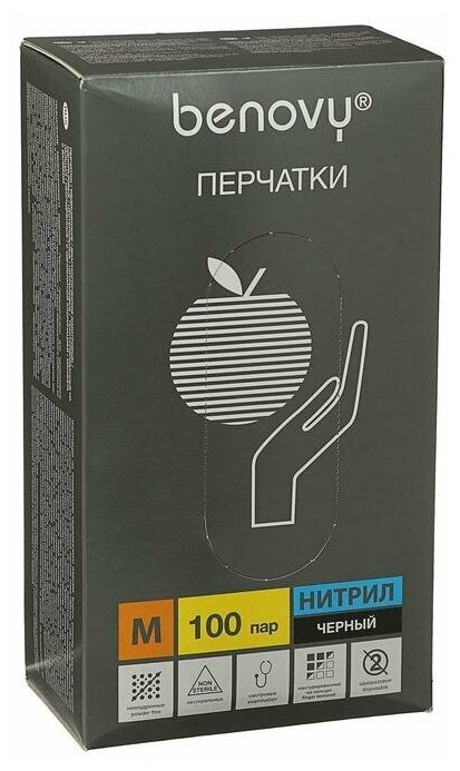 BENOVY Перчатки нитриловые 50 пар, черные, размер M, одноразовые, медицинские