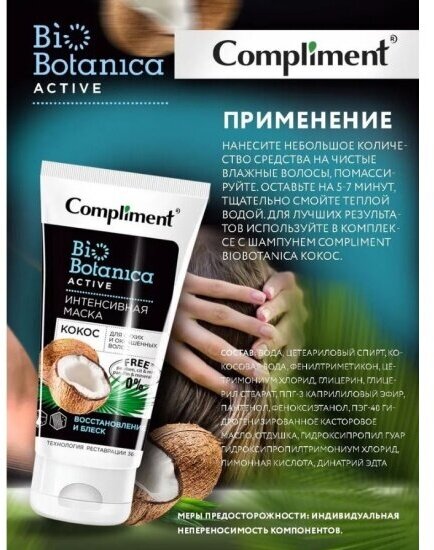 Compliment Biobotanica active Интенсивная маска Кокос Для сухих и окрашенных волос Восстановление и блеск 200мл информация:
