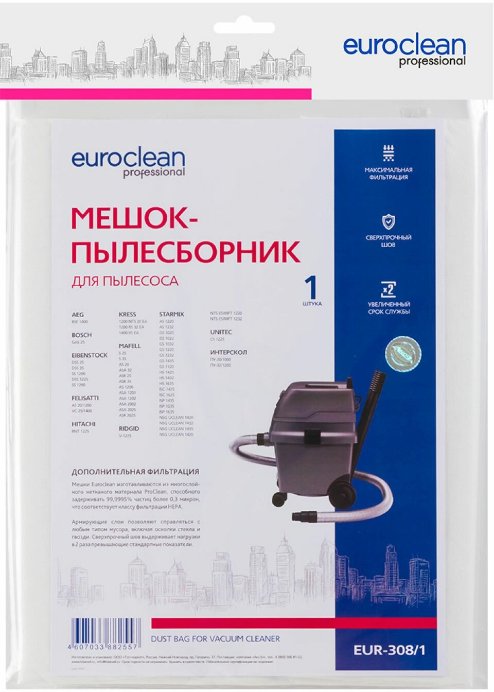 Euroclean EUR-308/1 Мешок для пылесоса BOSCH GAS 25 KRESS 1400 ИНТЕРСКОЛ ПУ-32/1200 STARMIX FB20/25/35 AEG FELISATTI HITACHI METABO 1 шт. синтетические / пылесборник