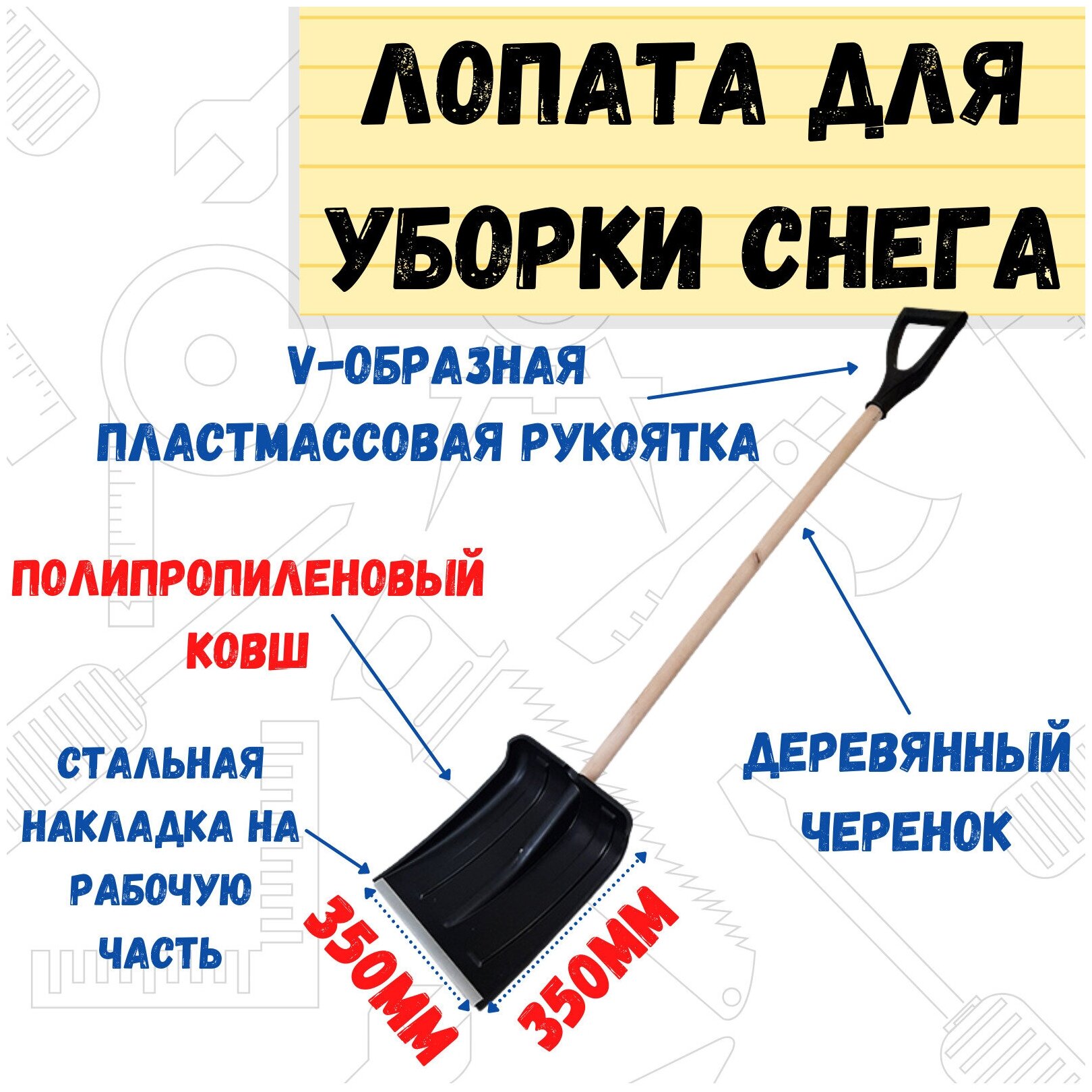 Снегоуборочная пластмассовая лопата РемоКолор деревянный черенок, V-образная ручка, 350x350 мм, 69-0-449 информация: