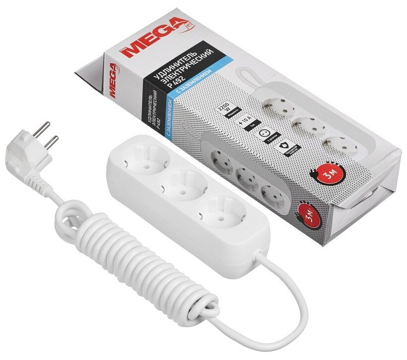 Удлинитель ProMEGA jet p492, 3 розетки, с/з, 10А / 2200 Вт белый 3 м