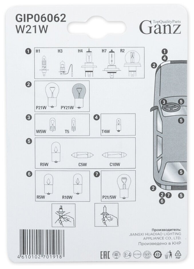 GANZ GIP06062 Лампа W21W 12v21w (W3X16d) -блистер- 2шт. информация: