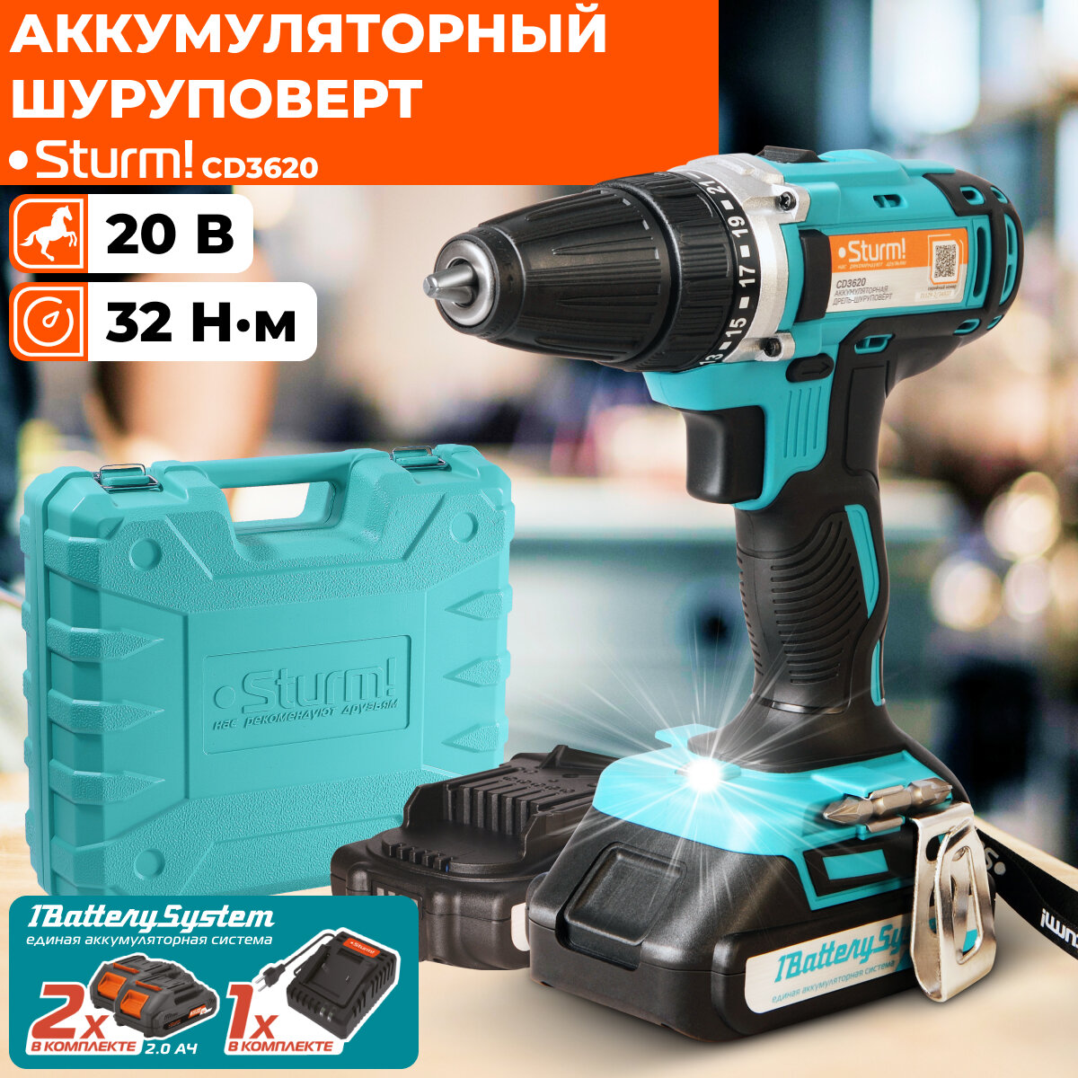 CD3620 Дрель аккумуляторная Sturm!, 20 В, 1BatterySystem, 2 акк., 2,0 Ач, кейс