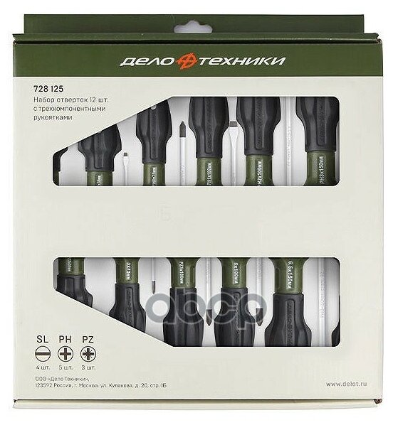 Набор отвёрток c трехкомпонентными рукоятками SL, PH, PZ, 12штук, Дело Техники, 728125 2 132 ₽