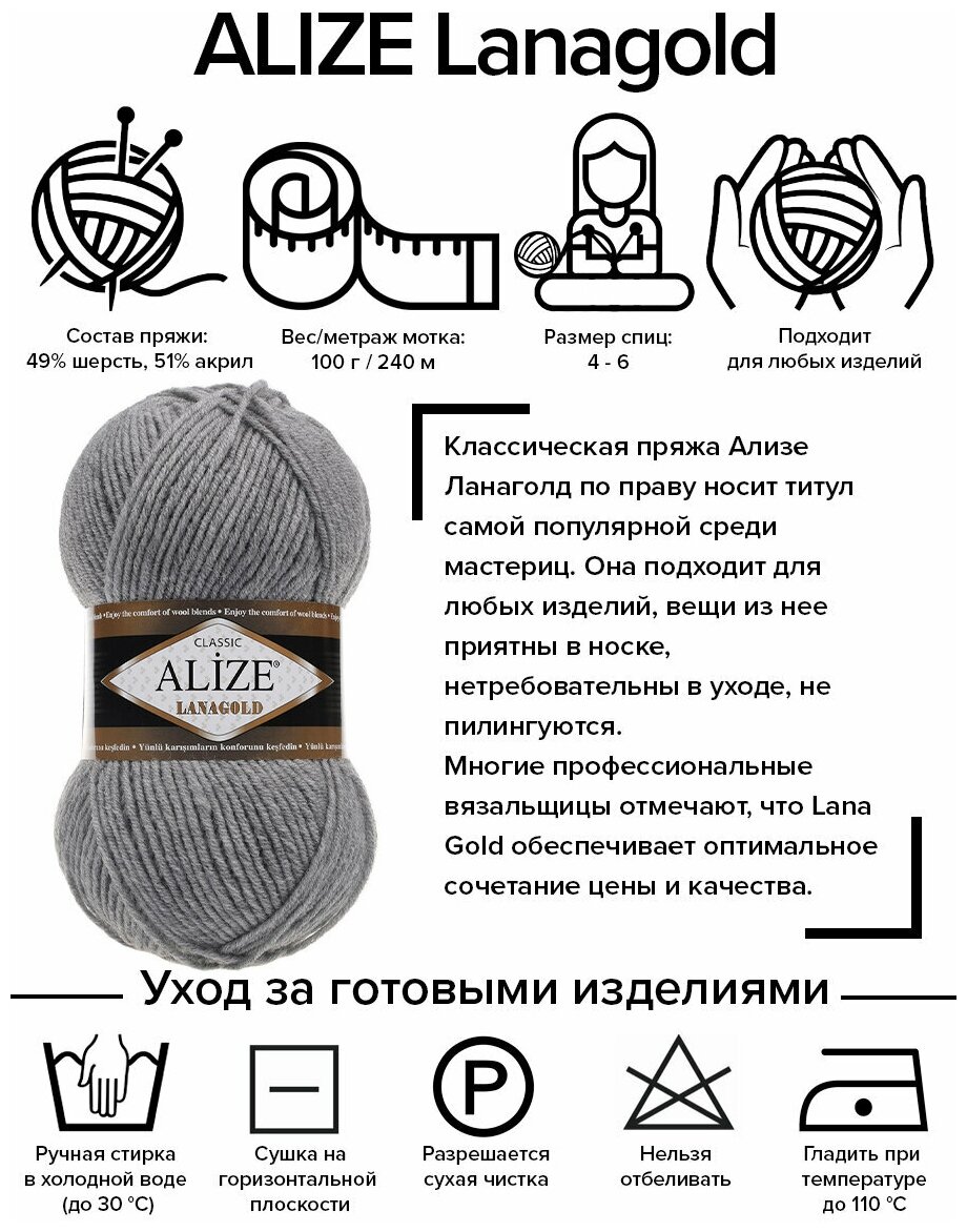 10 цен на Пряжа ALIZE Lana Gold цвет 021 серый меланж Лана Голд 1 упаковка 5 мотков по 100г по 240м, турецкая полушерсть, теплая, мягкая нить