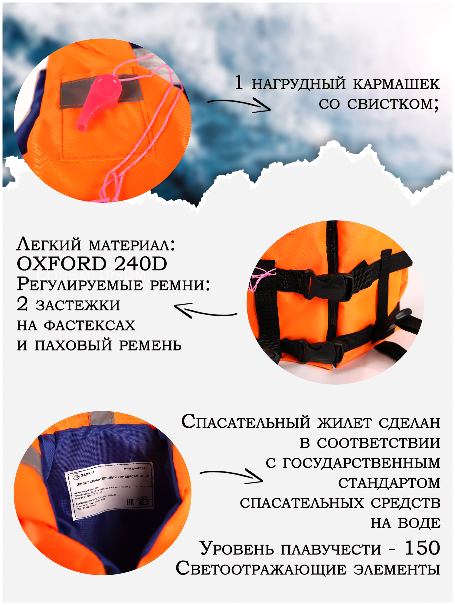 Спасательный жилет GAOKSA / Гаокса, 70-90 кг с подголовником и светоотражающими элементами