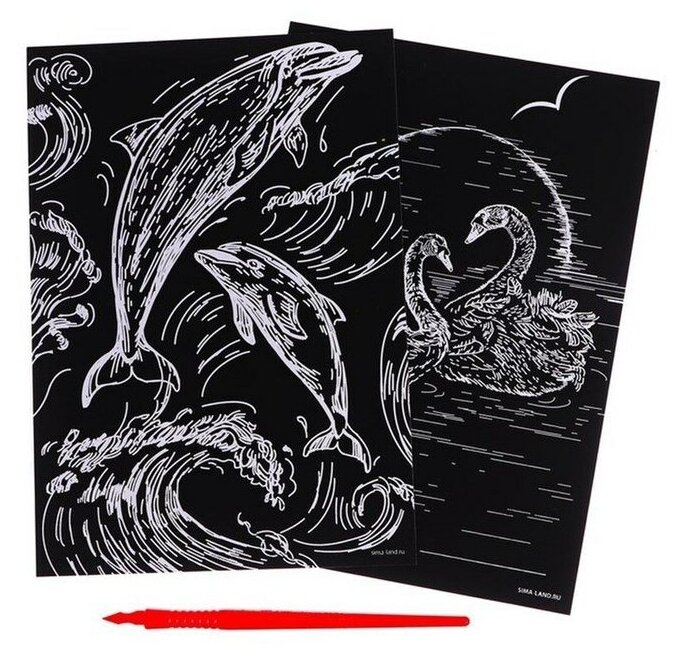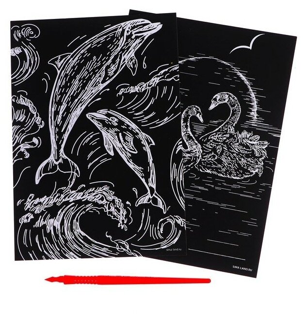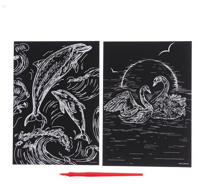 Набор гравюр "Дельфин и лебеди" со штихелем, с металлическим эффектом "золото", 2 шт, А5, основа для картины с нанесенным контуром, набор для рисования и творчества, скретчинг