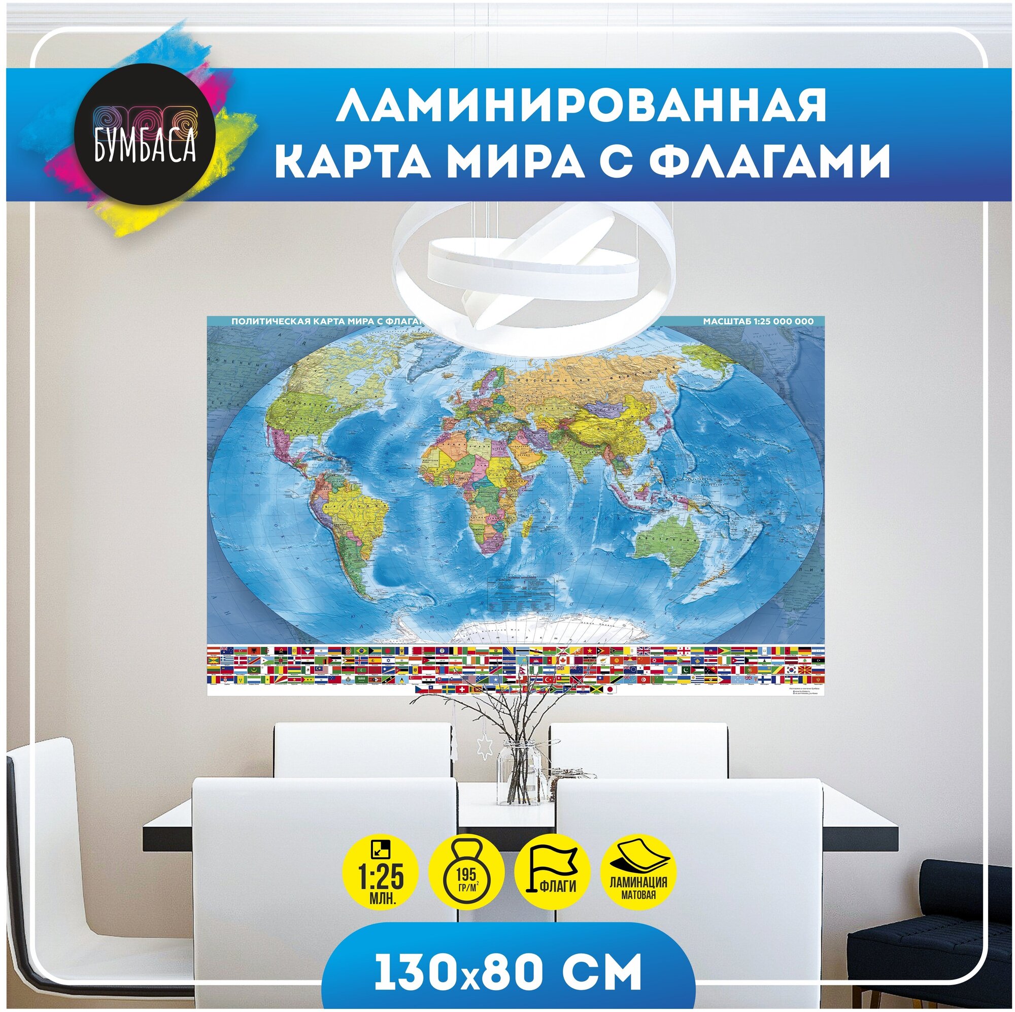 10 цен на Настенная Карта Мира, Ламинированная с Флагами, Политическая. 130х80 см. Бумбаса.