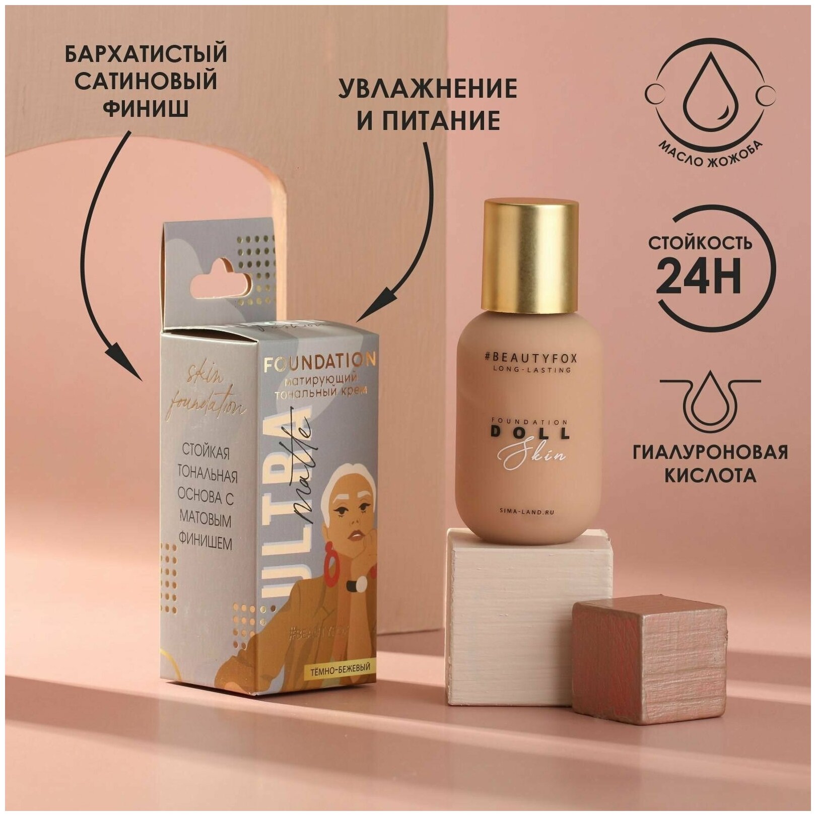 Beauty Fox Тональная основа с гиалуроновой кислотой и маслом жожоба Ultra matte, оттенок 02, карамельно-бежевый, 40 мл