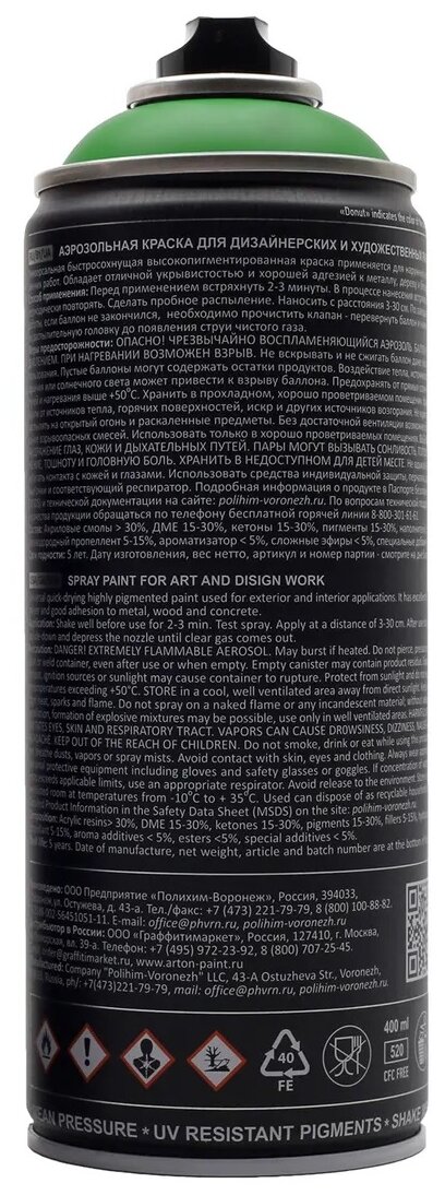 Аэрозольная краска для граффити и дизайна Arton A605 True Green 520 мл (истинно-зеленый) информация: