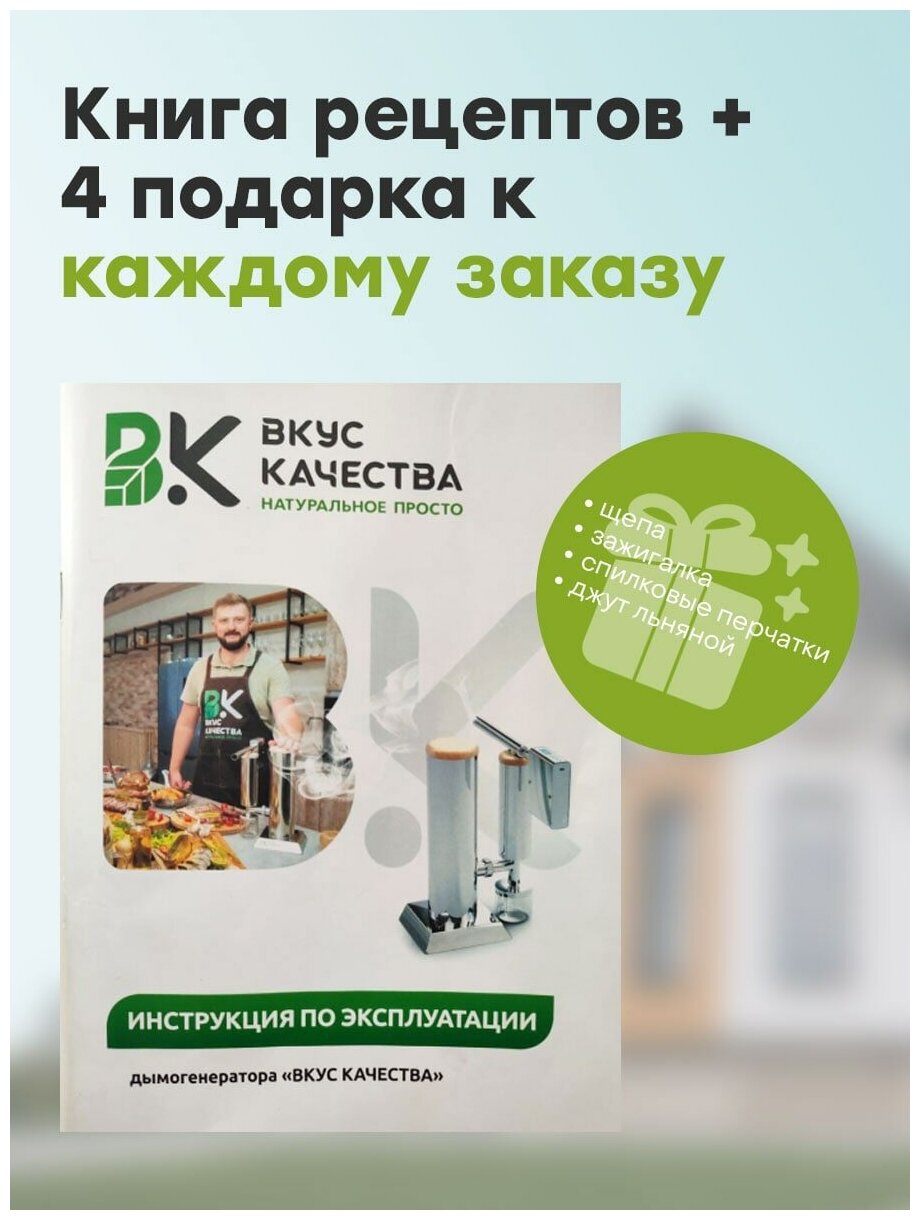 | Дополнительная информация | Нижняя эжекция - дым не проходит через слой щепы, поэтому на неё не оседают смолы. Сама щепа остаётся сухой, не склеивается, не мокнет и не тухнет. Смолы и сажа отделяются от дыма в смолоотделителе и попадают в сборник для вредных примесей, который можно очистить без остановки копчения |