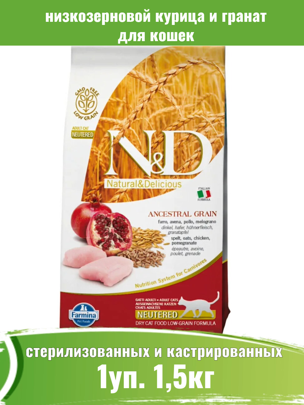 FARMINA CAT N&D ANCESTRAL GRAIN NEUTERED CHICKEN & POMEGRANATE низкозерновой для взрослых кастрированных котов и стерилизованных кошек с курицей и гранатом (1,5 кг)