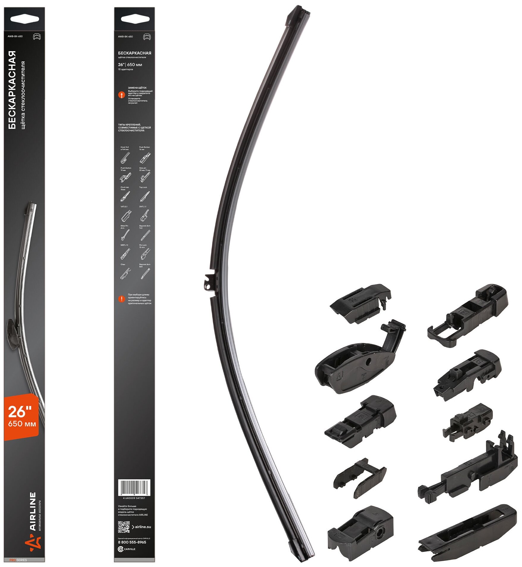 AWBBK650 AIRLINE Щетка стеклоочистителя бескаркас PRO 650мм (26) 10 адаптеров (AWB-BK-650)