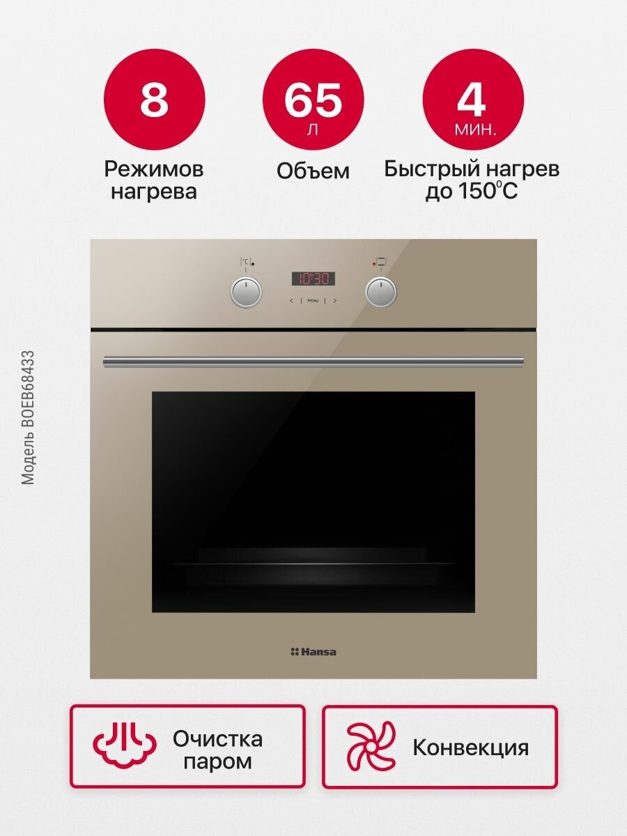 10 цен на Электрический духовой шкаф Hansa встраиваемый BOEB68433, 60 см, с грилем и конвекцией, 8 режимов работы, таймер, функция быстрого нагрева, очистка паром