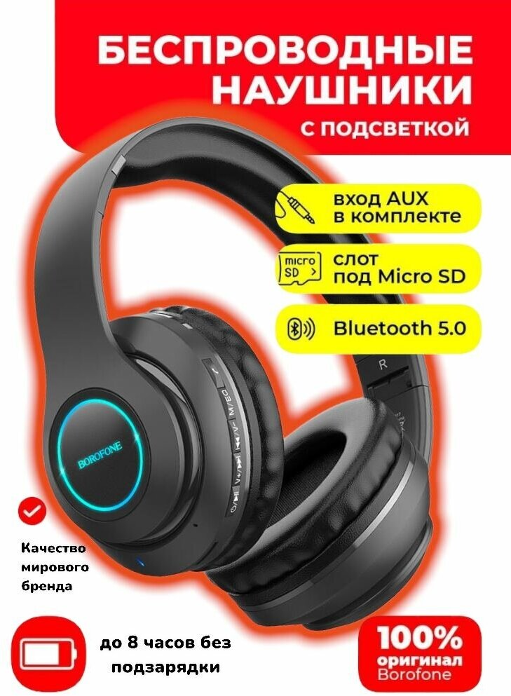 Беспроводные наушники BOROFONE GAME MUSIC BO17//накладные с шумоподавлением /светящиеся с подсветкой/синий