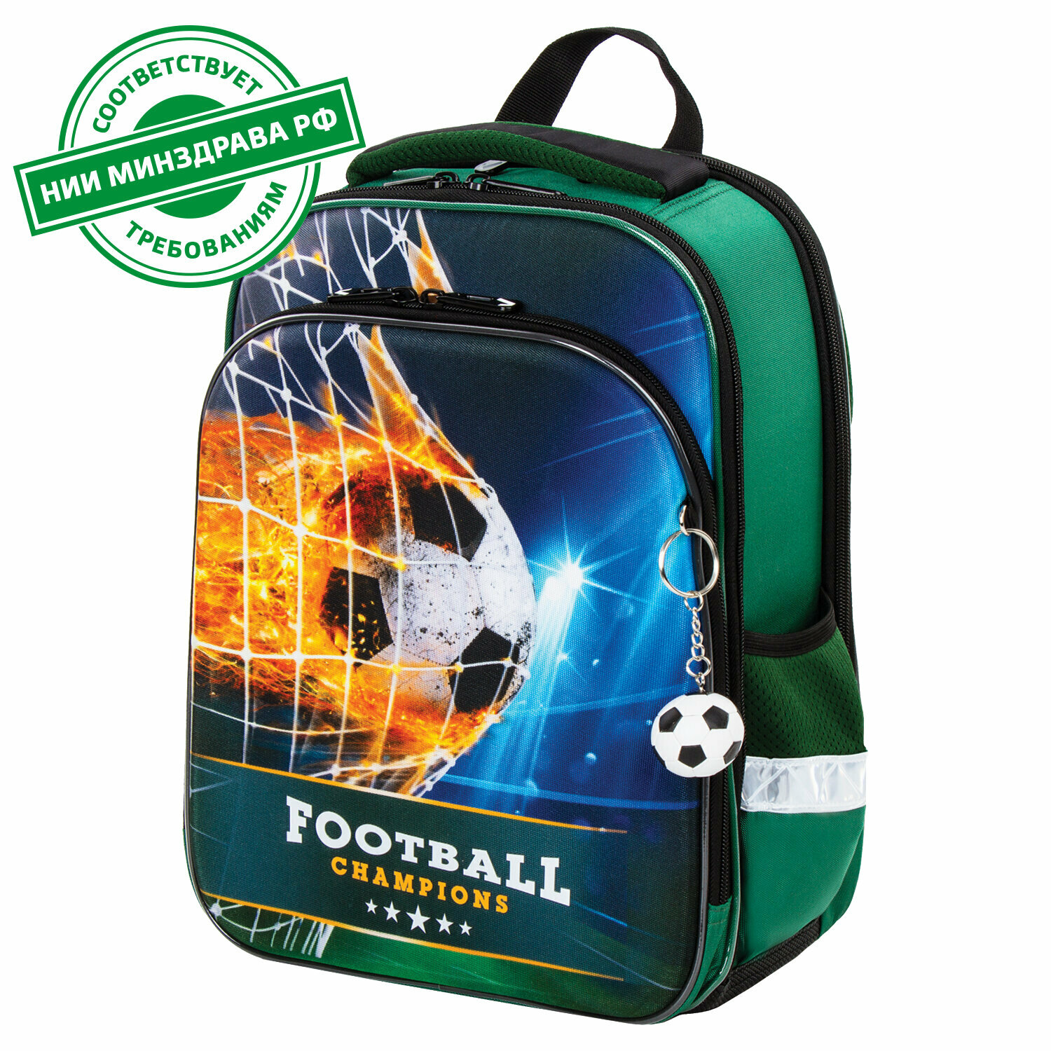 Ранец (рюкзак) школьный для мальчика первоклассника Brauberg Quadro, 3 отделения, с брелком, Fire football, 37х28х18 см, 229956