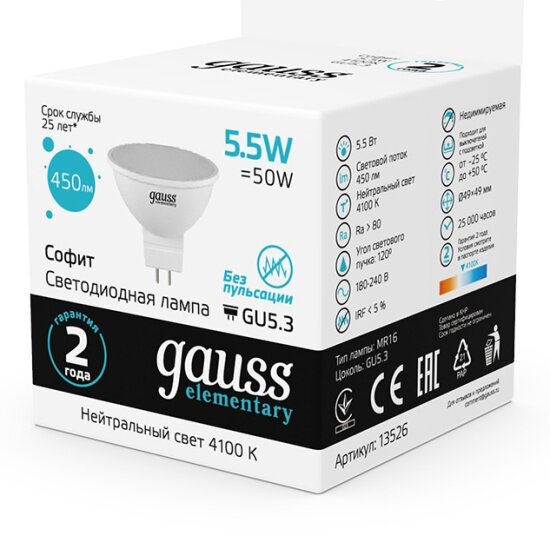 Светодиодная лампа Gauss LED Elementary MR16 GU5.3 5.5W 4100К. информация: