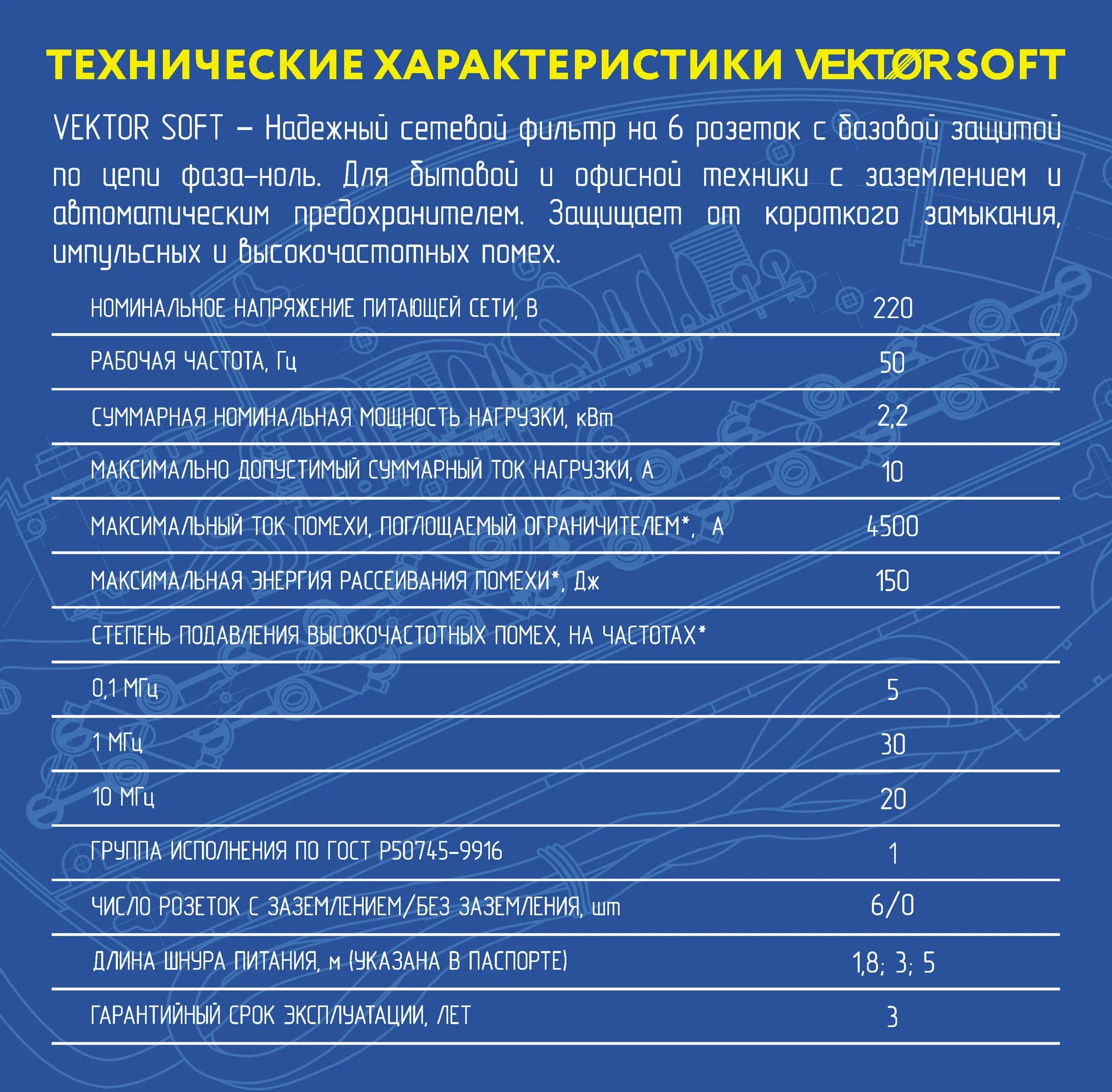 Сетевой фильтр VEKTOR SOFT, 6 розеток, с/з, 10А / 2500 Вт 3 м информация: