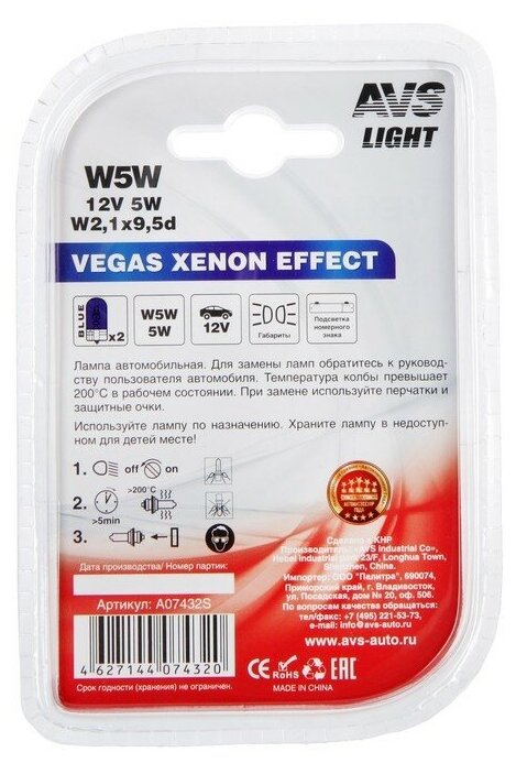 Лампа автомобильная ТероПром 4931580 AVS Vegas xenon effect, W5W, 12 В, 5 Вт, набор 2 шт информация: