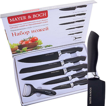 | Типы ножей в наборе | нож для овощей, универсальный нож, нож для хлеба, разделочный нож, шеф-нож |