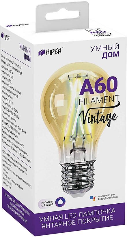 Умная лампа HIPER Filament Vintage E27 белая 7Вт 800lm Wi-Fi [hi-a60fiv] информация: