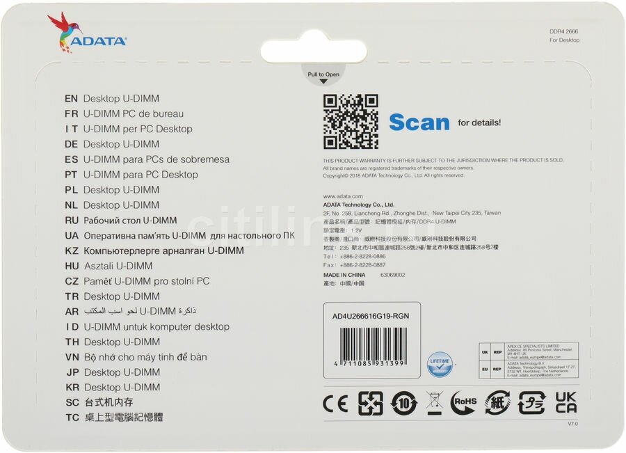 Модуль памяти Adata AD4U266616G19-RGN информация: