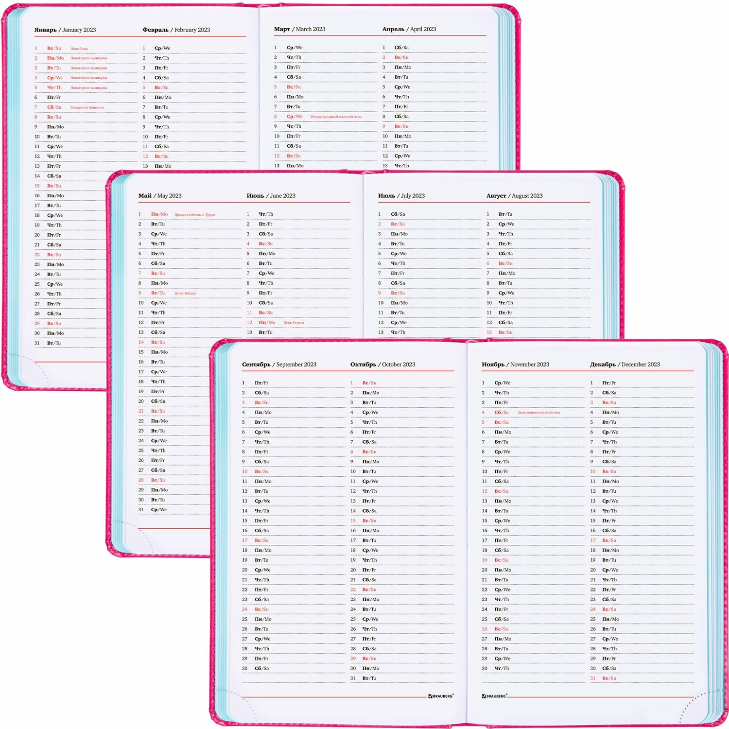 | Особенности | календарь / перфорация уголков / справочная информация / ляссе / прошивка по периметру обложки / закругленные углы |