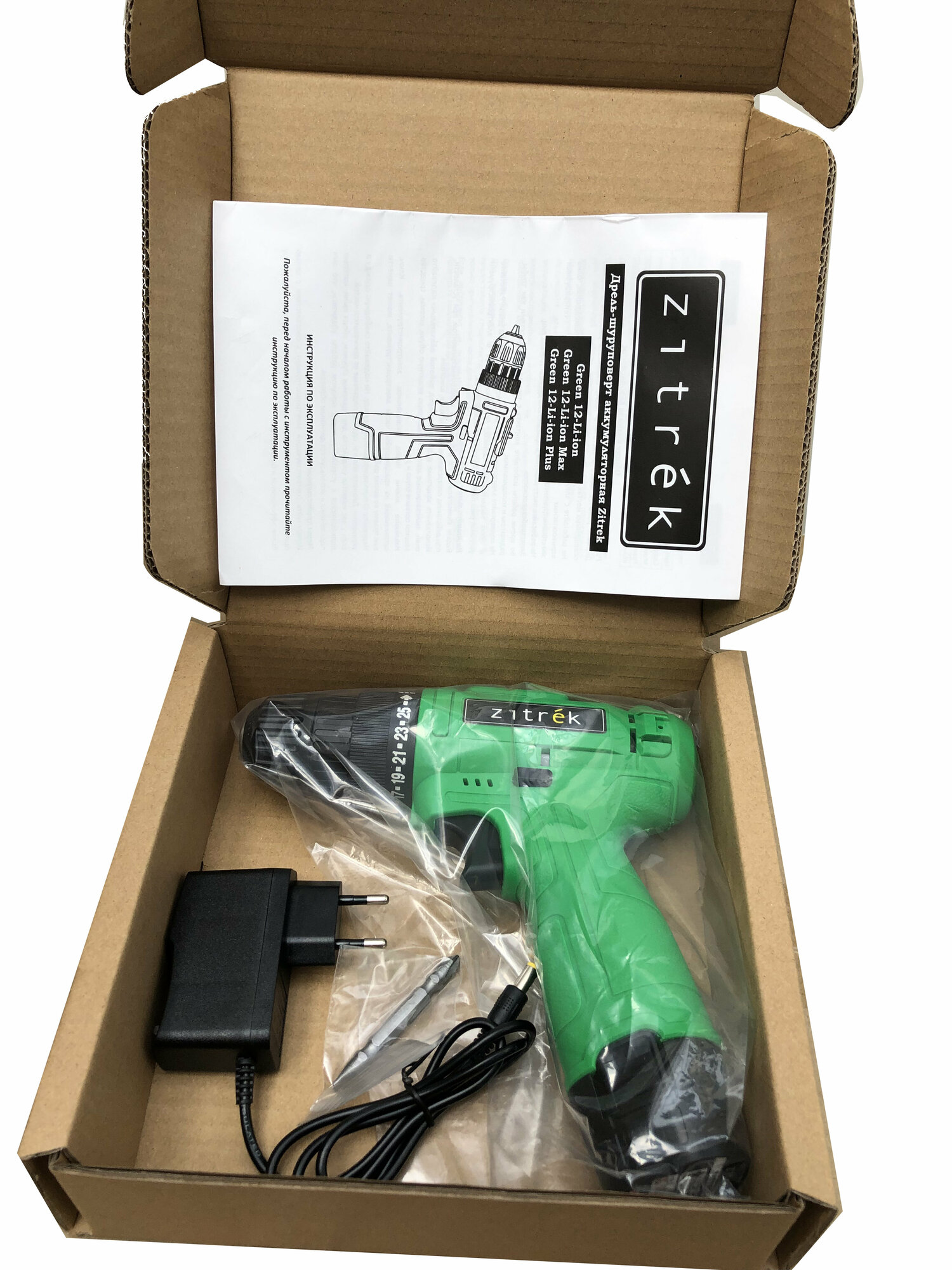 | Подробная комплектация | дрель аккумуляторная Zitrek Green 12-Li-ion (1 шт.), аккумулятор (1 шт.), двухсторонняя бита (1 шт.), зарядное устройство (1 шт.) |