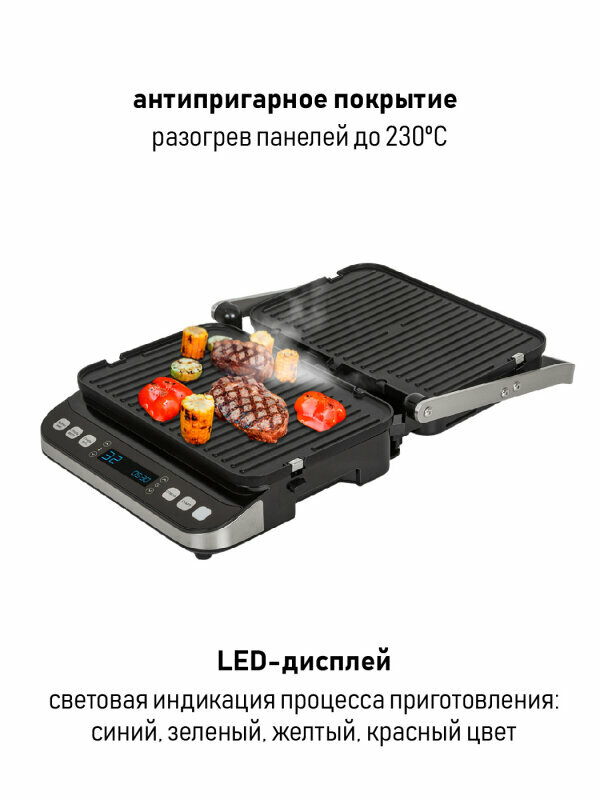 | Особенности | антипригарное покрытие / регулировка высоты верхней панели / поддон для сбора жира / съемные пластины |
