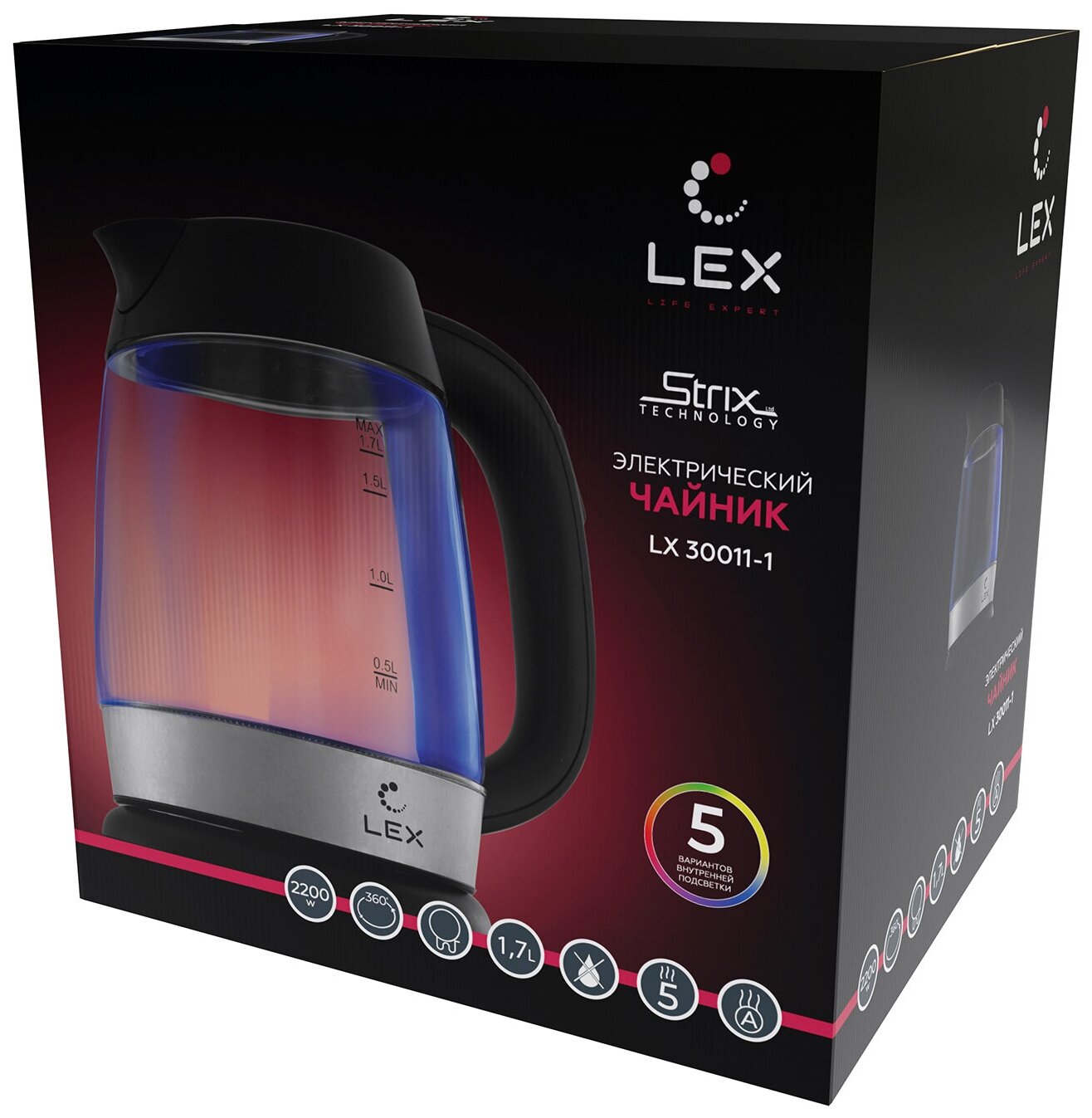 Чайник электрический стеклянный LEX LXK 30010-1, объем 1,2 л, подсветка.