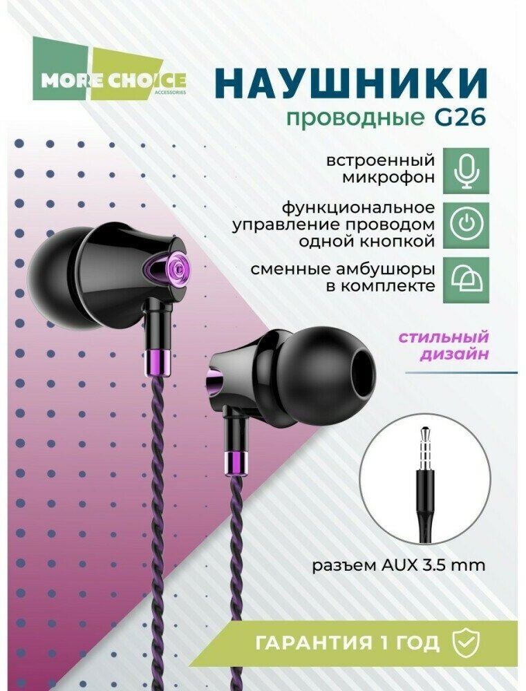 Наушники MORE CHOICE G26 проводные, вакуумные, 1,1м, черный/фиолетовый