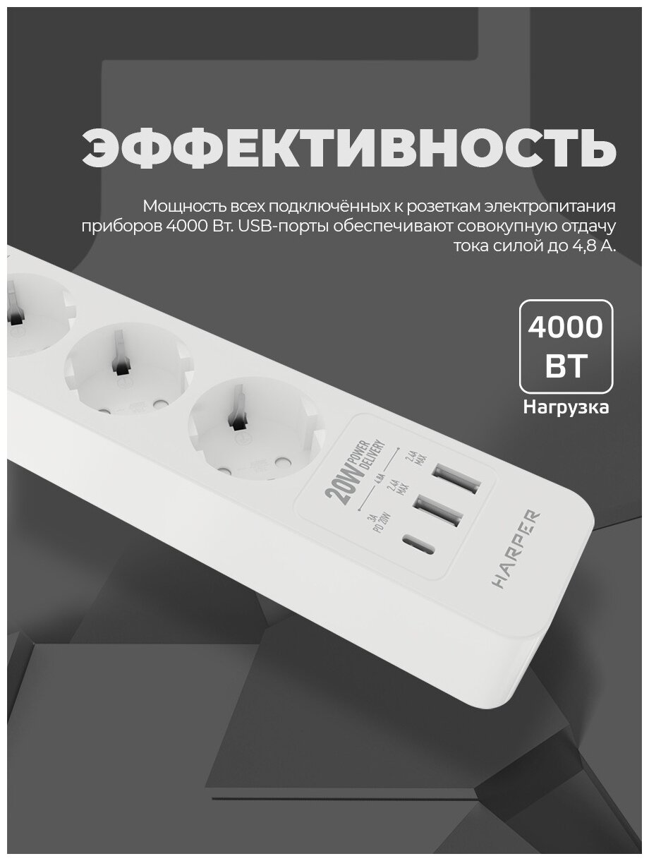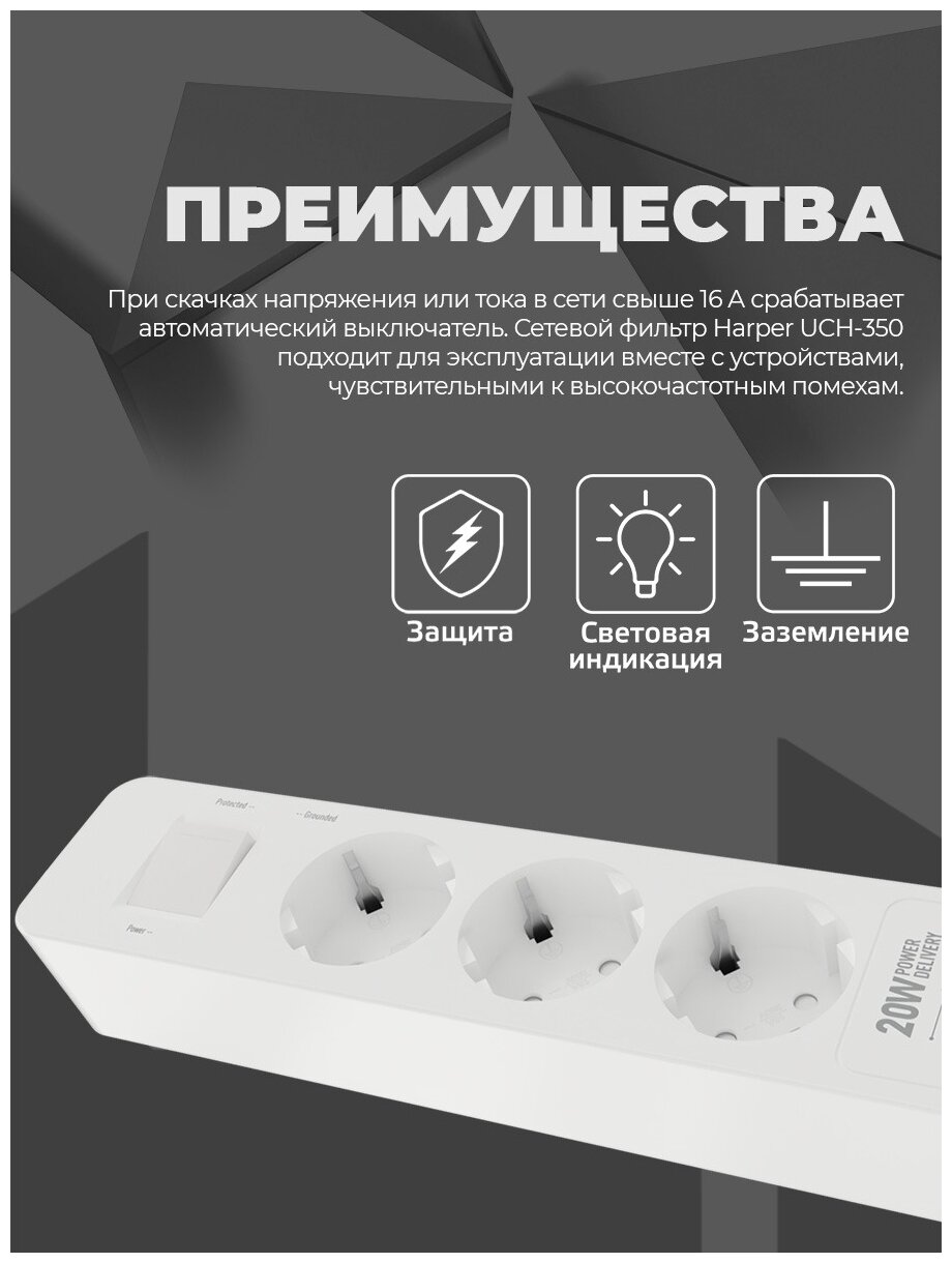 Harper Сетевой фильтр с USB зарядкой UCH-350 White PD3.0 3 роз1,5м 2xUSB+1xType-C портами, 4000W