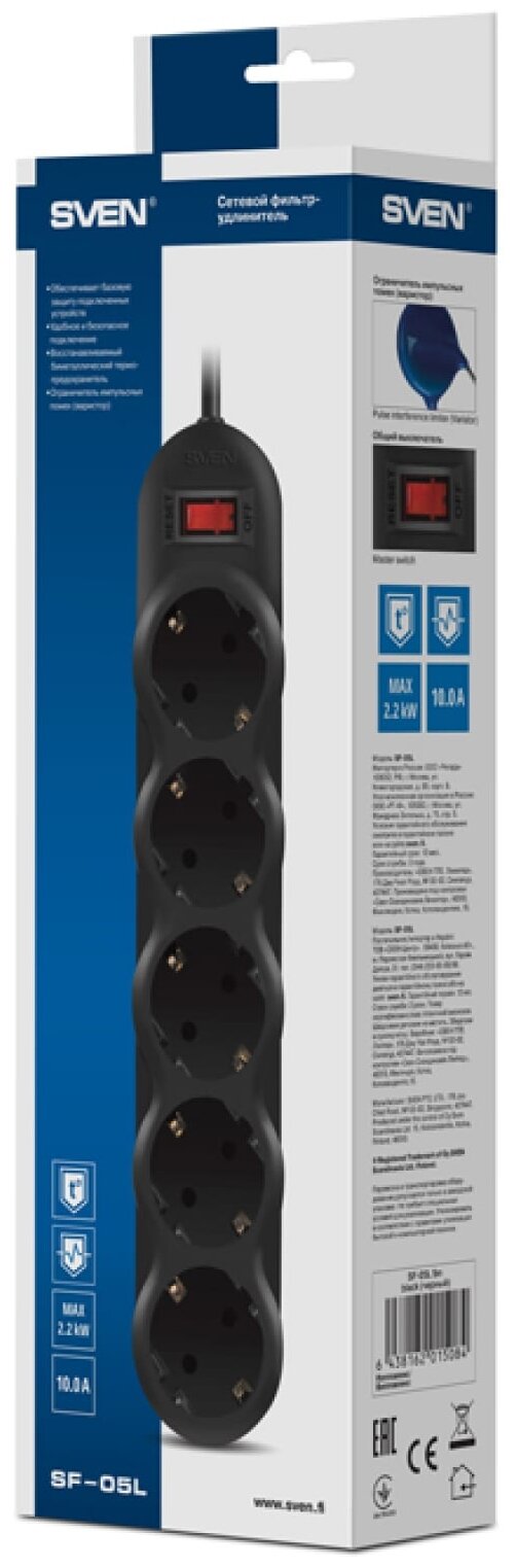Сетевой фильтр Sven SF-05E 5 евро розеток, 1,8 м черный, цветная коробка