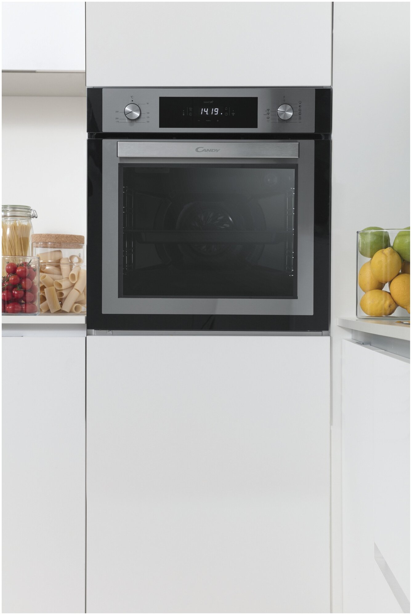 Многофункциональный духовой шкаф 60 см. Цвет: нержавеющая сталь. 8 режимов. Сенсорный дисплей. Удаленное управление через приложение Candy simply-Fi Режим (Wi-Fi). CookLight для здорового питания. Паровая очистка AquaActiva. Пиролитическая эмаль. Тангенци