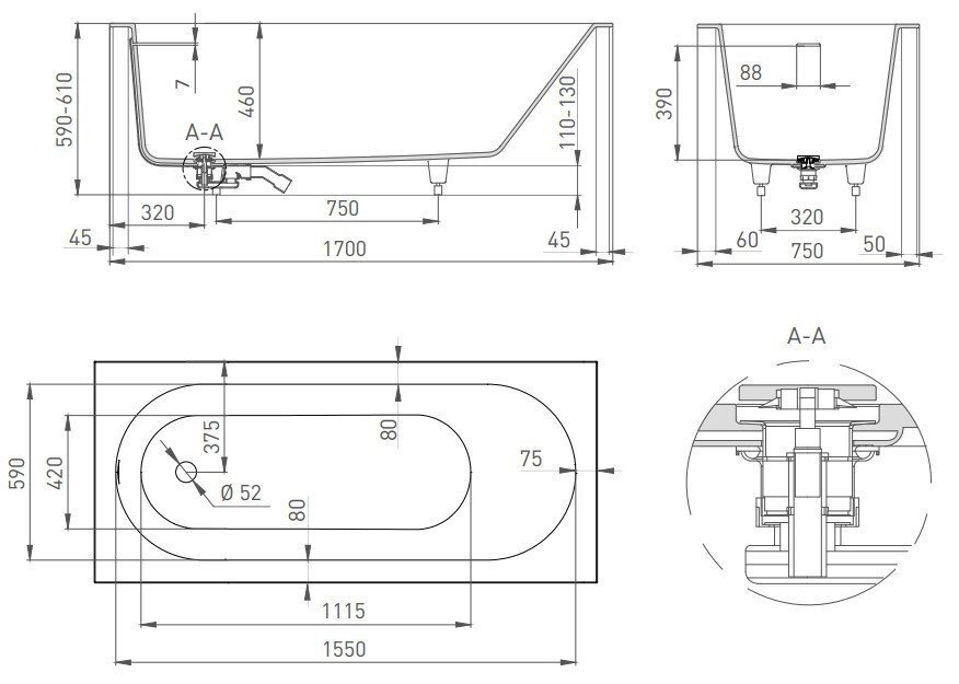 | Подробная комплектация | ванна, регулируемые ножки до 2 см, интегрированный слив перелив, донный клапан цвет белый |