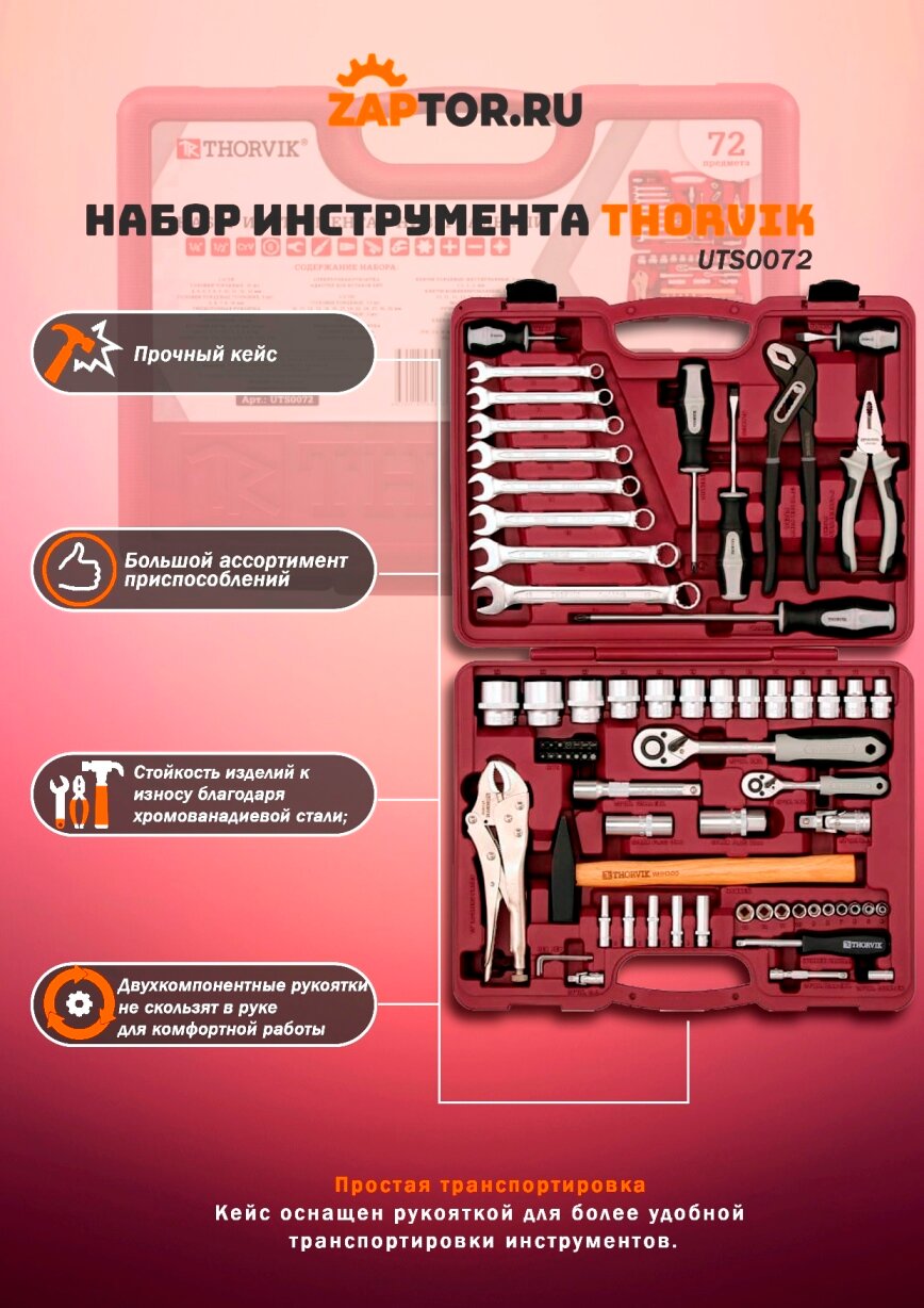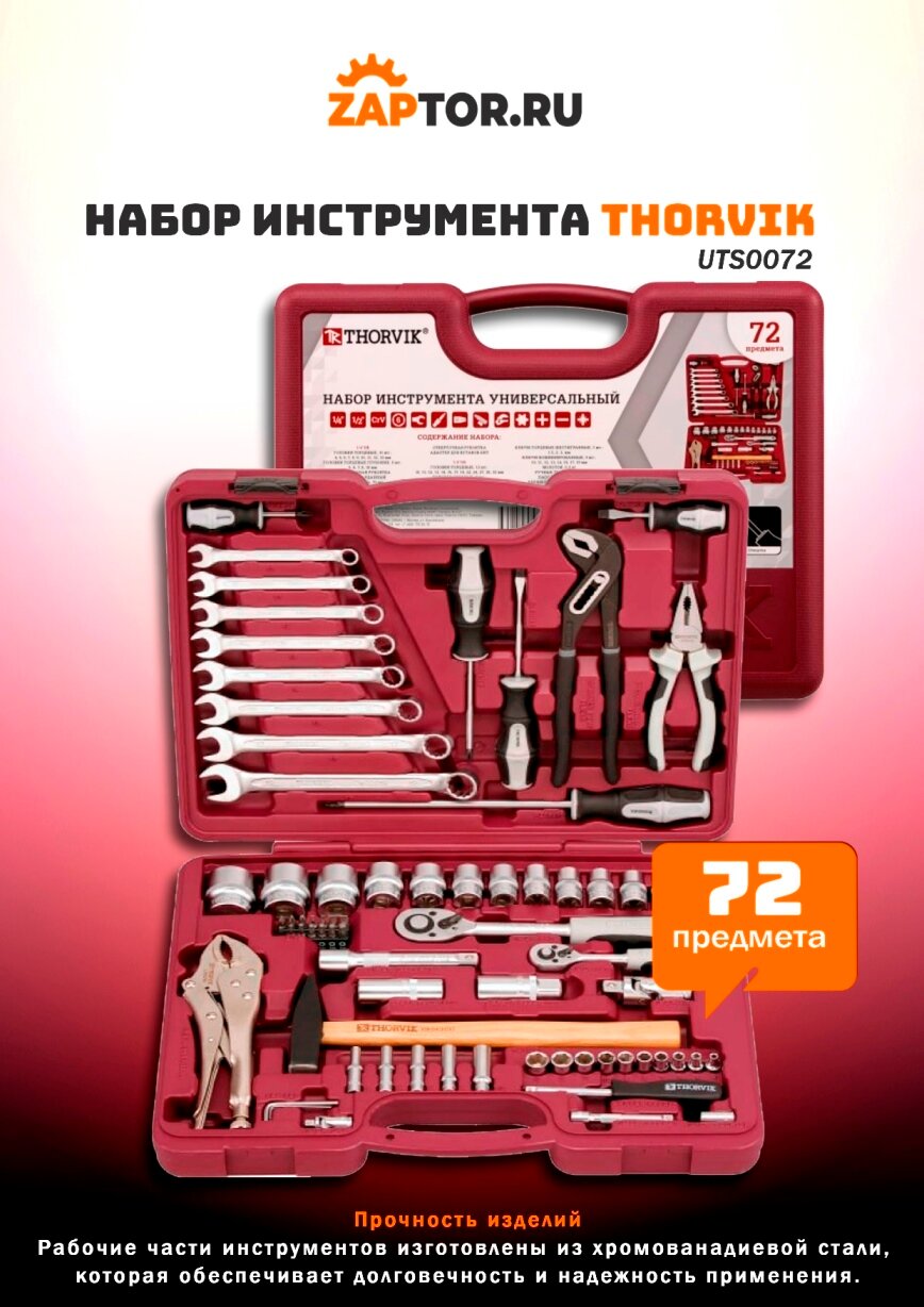 UTS0072 Thorvik Набор инструмента универсальный 1/4", 1/2"DR, 72 предмета информация: