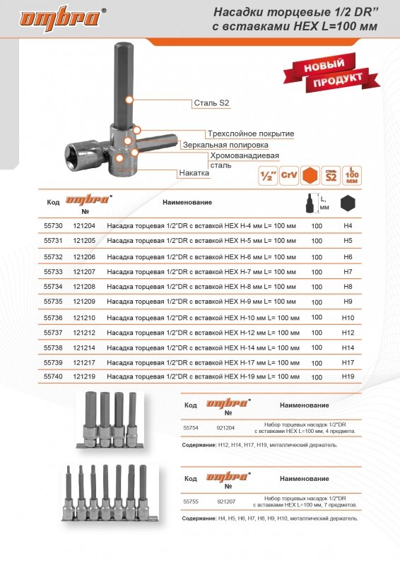 Набор Насадок Торцевых 1/2"Dr С Вставками-Битами Шестигранными На Держателе, H4-H10, 100 Мм, 7 Предметов Ombra OMBRA арт. 921207 информация: