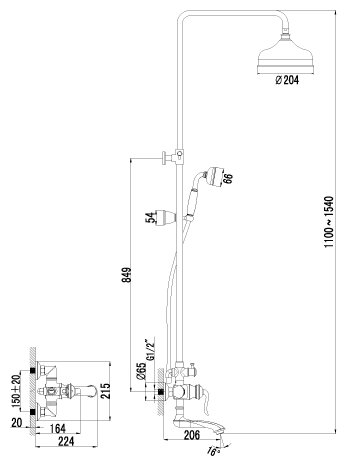 | Дополнительная информация | высота стойки для душа: 1540 мм; диаметр душевой лейки: 66 мм; диаметр верхнего душа: 204 мм |