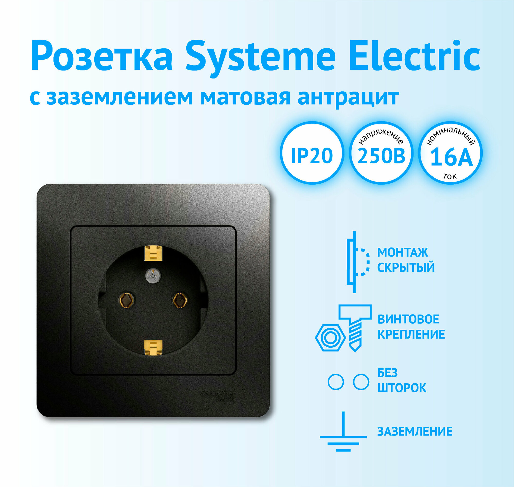 Розетка Systeme Electric (schneider Electric) SCHNEIDER ELECTRIC с/з, 16А (в сборе) SE Glossa Антрацит GSL000742
