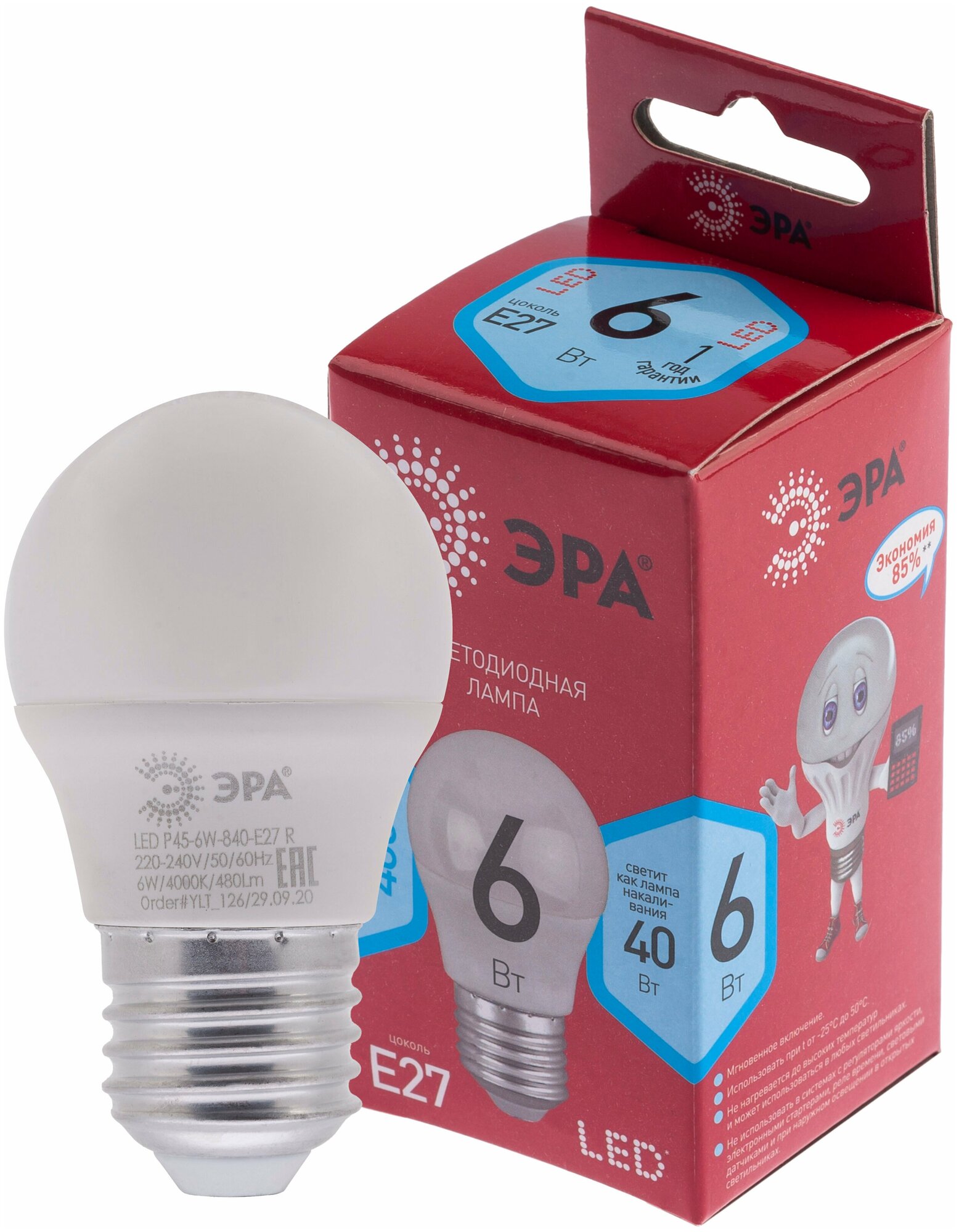 Лампа светодиодная шар 6Вт Е27 4000К LED P45-6W-840-E27 R ЭРА информация: