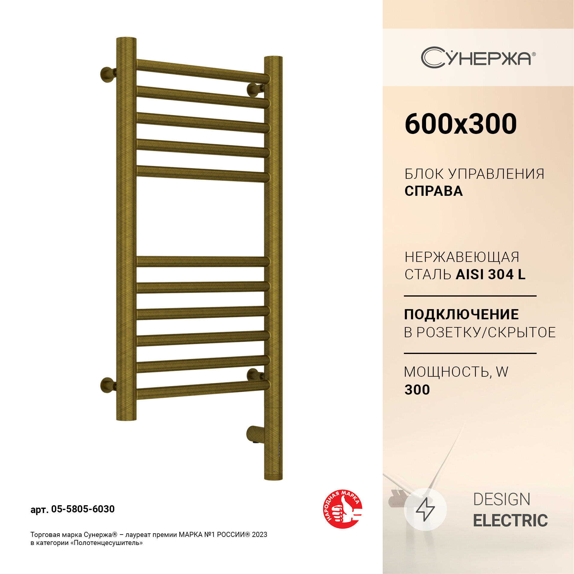 Полотенцесушитель электрический Сунержа Богема 3.0 прямая, 600x300, МЭМ правый, золото 03-5805-6030 31 800 ₽