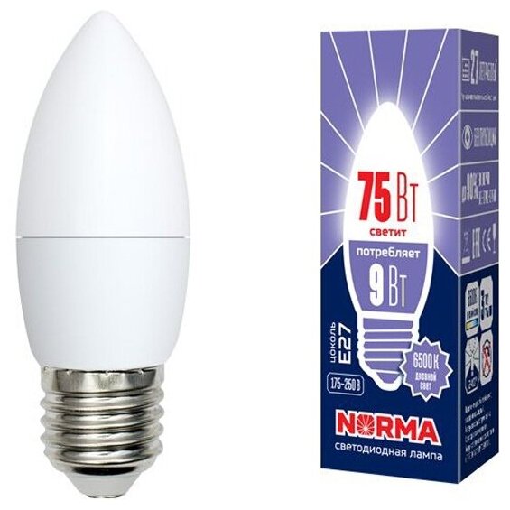 10 цен на Volpe LED-C37-9W/DW/E27/FR/NR Лампа светодиодная. Форма "свеча", матовая. Серия Norma. Дневной белый свет (6500K). Картон. ТМ Volpe
