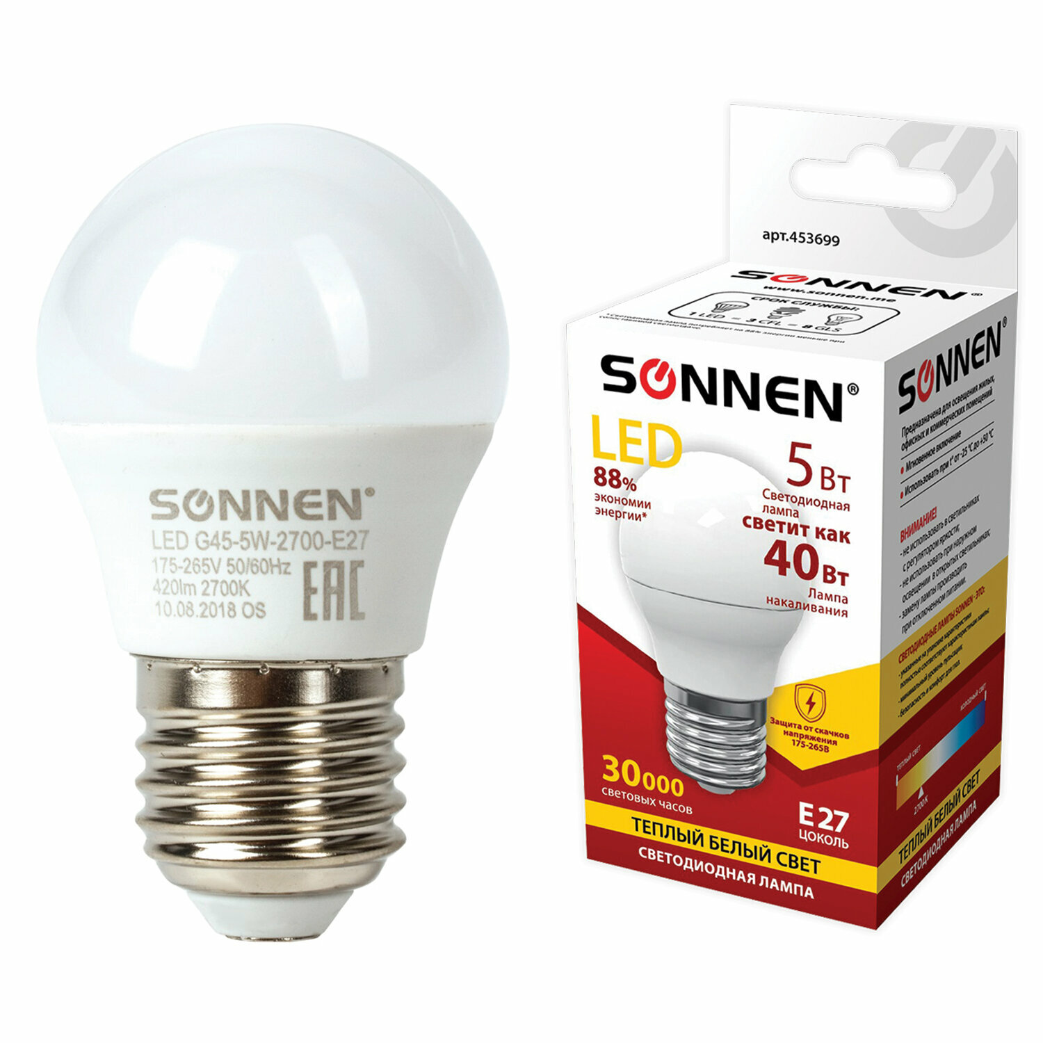 Отзывы на Лампа светодиодная Sonnen 5 вт, цоколь e27, шар, теплый белый свет, 30000 ч, g45-5w-2700-e27