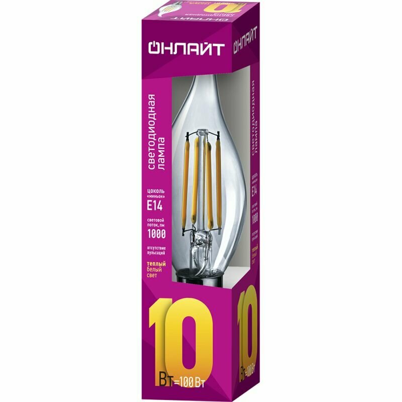 Лампа светодиодная филаментная 80 898 OLL-F-FC35-10-230-2.7K-E14 10Вт свеча на ветру прозрачная 2700К тепл. бел. E14 1000лм 220-240В онлайт 80898 информация: