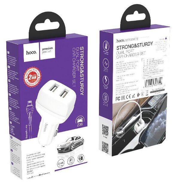 Отзывы на Блок питания автомобильный 2 USB HOCO Z36 Leader, 2400mA, кабель Lightning 1м, огнестойкий, пластик, белый